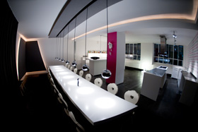 Der rund 100qm große, nahezu quadratische Raum besticht durch eine nüchterne Klarheit, die durch klassische, fast heimelige Elemente durchbrochen wird. Asymmetrische Linien in weiß und grau erhalten durch eine speziell für den Raum entwickelte Wirtshausbestuhlung einen gekonnten Stilbruch. Ein herzliches Wandtattoo mit Glücksmomenten, eine Kuckucksuhr und die atmosphärische Beleuchtung des Raums sorgen für eine hohe Aufenthaltsqualität. Der Raum ist am Tage Besprechungsraum und Treffpunkt der Mitarbeiter der Agentur und verwandelt sich an den Abenden und Wochenenden zum Speisezimmer und zur Privatbar. Möglich sind private und geschäftliche Feiern im diskreten Umfeld mit bis zu 120 Gästen.